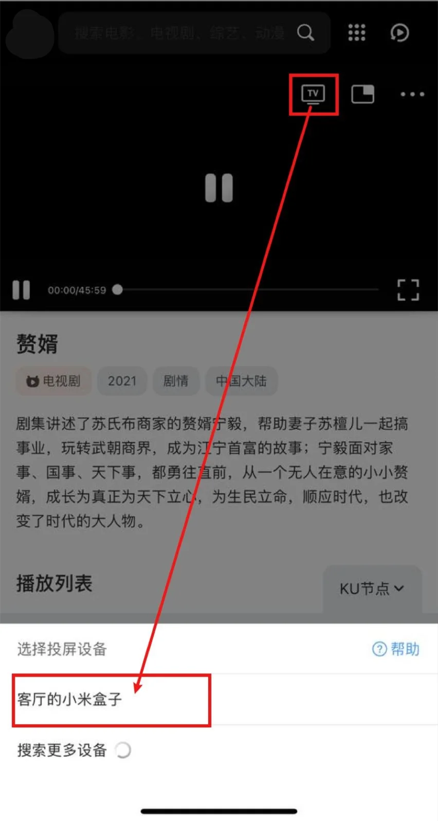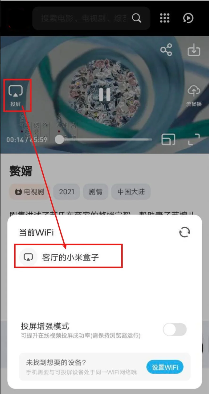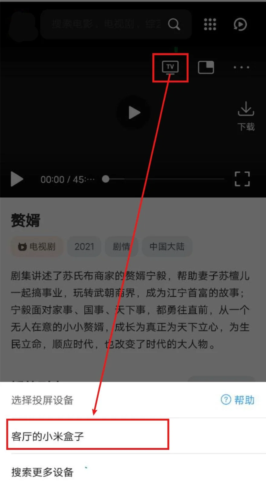 打开QQ浏览器(会接管网页播放器)->打开口登短剧->播放视频->选中投屏图标->等待搜寻出智能电视/电视盒子->选中,即可投屏。